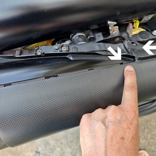 上から見たら素材が違うのでボックス状のケース側とで色が全然違っておかしいのは仕方ないとしても、この矢印の部分が致命的です。右の矢印部分はサブフレーム側に乗っからなきゃいけなくて、左の爪は、少ししなってボックス側の穴に入ってくれないといけないところ、カーボンという素材の特性上全然しなってくれなくて爪が入りません。