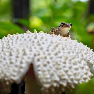 引き続き景色を眺めたりして過ごしていましたが、あまりに暇なので散策してみたらいい写真が撮れました。このトゲトゲなキノコは何なんでしょうね。よくぞこのタイミングでカエルが乗っててくれたもんだと嬉しくなりました。
