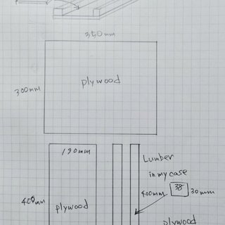使ったのは、10mm厚の合板(300mm x 900mm)をホムセンでカットしてもらって、角材もホムセンで売ってる普通の角材をカットしたもの、固定するための木ネジと下穴を開けるドリル、塗装はダイソーの黒ペンキと刷毛です。