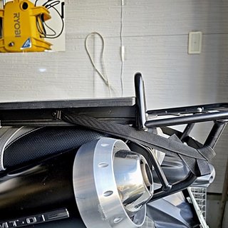 TANAX MFK-222を載せるためのベースが荷物の重みで前にズレないように、横にベルトを通すフックを付けました。